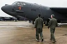 Colonel Paul Tibbets IV (left) looks at the nose art on a 93d Bomb Squadron B-52H Stratofortress at Barksdale Air Force Base, Louisiana, which resembles that of the B-17 Flying Fortress that his grandfather piloted during World War II
