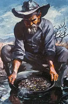 Von Klieben produced detailed concept art for proposed buildings and also floor plans. He oversaw construction and the process for converting new lumber into weathered-looking boards by the use of burning, sandblasting, scraping, pounding, twisting, painting multiple colors and wire brushing. He also personally painted the concrete in the original Pan for Gold attraction to look like rock.[22]