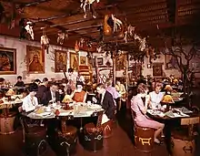 The cyclorama, under the genius of this man, came out a masterpiece. The only concession Paul asked, to which Walter Knott readily agreed, was the exclusive right to manufacture and sell art souvenirs, booklets and paintings on the premise.[12] Von Klieben lived on the farm and had his studio "at the end of the Ghost Town Trail," in "the adobe building which adjoins Ghost Town" that was completed shortly before February 1942 and was constructed of adobe bricks made on the property. This building is likely that which is now used as the entrance to Spurs restaurant.[13][14]