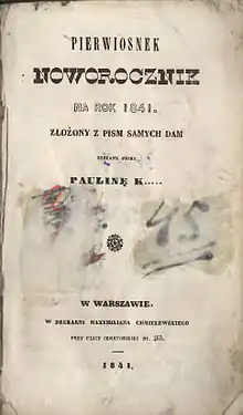 The first Polish collective publication created exclusively by women, Pierwiosnek had a group of participants largely made up of pupils and followers of Klementyna Hoffmanowa and Stanisław Jachowicz.[4] They included Narcyza Żmichowska, who was first published there. It was published from 1838 to 1843. Pierwiosnek opposed the emancipation of women, and published anonymous articles with masculinist advocacy.[5] Żmichowska was a leader in the Entuzjastki feminist group, whose poems were published in Pierwiosnek by Krakowowa.[6] Efforts by Piotr Chmielowski to identify the Entuzjastki as distinctive literati, rather than activists, have, however, been criticised.[7]