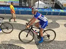 Pauline Ferrand-Prévot (born 10 February 1992) is a French multi-discipline bicycle racer, who rides for UCI Mountain Bike team Ineos Grenadiers in cross-country cycling.[5] Ferrand-Prévot has also competed in road bicycle racing and cyclo-cross during her career,[6] winning the world title in each discipline. During the 2015 season, aged just 23, she became the first person ever – in the history of cycling – to simultaneously hold the World road title, World cyclo-cross title and World cross-country mountain bike title.[7]
