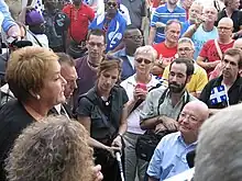 Following two failed leadership runs in 1985 and 2005, Marois briefly left political life in 2006. A year later, she stood unopposed to become the seventh leader of the Parti Québécois on June 26, 2007. From 2008 to 2012, she served as leader of the Official Opposition. In spite of internal strife in 2011 and early 2012, where she survived several challenges to her leadership from prominent members of her caucus – earning her the nickname Dame de béton,[9] "Concrete Lady" – she led the Parti Québécois to victory with a minority government in the 2012 Quebec general election, thus becoming the first female premier in the province's history.[10] As Premier, Marois closed down Quebec's only nuclear reactor, ended asbestos production in Quebec, and pacified the province's turbulent campuses. Her government's highest profile initiative was the proposal of a controversial Quebec Charter of Values which would have banned the province's 600,000 government employees from wearing religious symbols including turbans, Islamic veils and Jewish kippahs.[8] However, the crucifix (notably, the one hung by above the speaker's chair in the provincial legislature) would not have been banned under the Quebec Charter of Values.[11] Her party was defeated 19 months later in the 2014 Quebec general election, an election that she herself had called.[12] Marois was personally defeated in the riding of Charlevoix–Côte-de-Beaupré and announced thereafter her resignation as PQ leader.[13][14] Her electoral defeat marked the shortest stay of any Quebec provincial government since the Canadian Confederation and the lowest showing for the PQ since its first general election in 1970.[15][16]