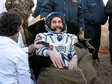 In January 2004, Vinogradov began training as the ISS Expedition 13 crew commander. The mission was launched aboard the Soyuz TMA-8 with Vinogradov and NASA astronaut Jeffrey Williams from the Baikonour Cosmodrome in Kazakhstan on 29 March 2006. Vinogradov served as the Soyuz commander. After two days of solo flight, Soyuz TMA-8 docked with the ISS on 31 March 2006. During their mission, Vinogradov and Williams hosted two NASA shuttle crews during their stay on board the ISS.[5] Space Shuttle Discovery visited the ISS between 6–15 July 2006. The main purposes of STS-121 were to test new safety and repair techniques introduced following the Columbia disaster as well as to deliver supplies, equipment and ESA astronaut Thomas Reiter from Germany to the ISS. Space Shuttle Atlantis brought the P3/P4 truss and its solar wings to the ISS during its STS-115 mission from September 9 to 21. The Soyuz capsule carrying Vinogradov undocked from the ISS at 5:53 p.m. EDT on 28 September 2006, and landed in the steppes of Kazakhstan near Arkalyk at 9:13 p.m. EDT.[6] Vinogradov was joined by NASA astronaut Jeffrey Williams and Spaceflight Participant Anousheh Ansari. Vinogradov spent 182 days, 23 hours and 44 minutes in space on board the Soyuz spacecraft and the ISS.[7]