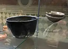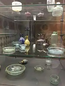 Also in the same room is the collection of Roman glass, probably the most important in northern Italy,[7] in which there are pieces of the highest quality and rarity, such as the dark blue glass kantharos from Frascarolo and the cup of Ennion.[8] the Roman glass in the museum stands out for its quality and typological variety. In the collection, ascribable in the majority of the pieces to the 1st and 2nd century AD, the most diverse processing techniques are testified