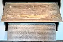 In the room there is also the large marble tombstone, found in Villaregio in the nineteenth century, by the philosopher Severino Boethius (about 480 - 524 or 526[11]), and the tombstones of King Cunipert, his daughter Cuniperga, Queen Ragintruda and Duke Audoald. Witnesses of Lombard sculpture at the time of King Liutprand are the well-known plutei of Theodota,[12] which depict the tree of life between winged dragons and a chalice flanked by peacocks, and the fragment of pluteus with a lamb's head from the former Royal Palace of Corteolona, while always linked to the royal past of Pavia is the inscription of the sarcophagus of Queen Ada (wife of King Hugh of Italy, who died in 931 and buried in the church of San Gervasio and Protasio) and the sella plicatilis, a folding chair of Carolingian or Ottonian art in iron coated with silver and gilded copper, a rare specimen (very few European museums retain furnishings from that era and almost none of them reach the quality of the Pavia specimen) due to its technical complexity and refined decoration.[13]