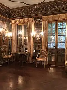 The Venetian Room, measuring 14 feet 10 inches (4.52 m) square,[40] is just east of the rotunda, on the south wall of the house.[31] It is accessed by wrought-iron doors from the rotunda.[41] Serving as a reception room for the Whitney family, the Venetian Room was used to receive guests before they proceeded upstairs.[32][40][41] The room's furnishings include painted furniture and a French-style clock.[40][41] The walls contain mirrored panels framed by gold leaf.[40][42] In place of a cornice, the coved ceiling was originally decorated with a latticework pattern containing plants and enameled flowers.[34][43] Other decorations include high Renaissance doorways and mantels, as well as a candelabra in the Bavarian rococo style.[42] As of 2021, the public has limited access to the room.[44] North of the Venetian Room is a corridor leading from the rotunda to restrooms and private offices.[31]