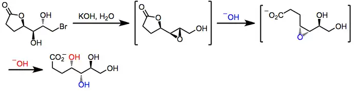 The Payne rearrangement occurs with inversion of stereochemistry at C-2. Substrates containing multiple adjacent hydroxyl groups may undergo "cascade" epoxide migrations with inversion at each site of nucleophilic attack. In one example, inversion of three contiguous stereocenters results after two epoxide migrations, opening of the epoxide by carboxylate, and hydrolysis of the resulting lactone.[7]