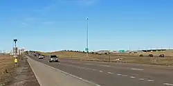 Peña Boulevard begins at an interchange with I-70 in Aurora as a northern continuation of Airport Boulevard. The first freeway interchange is at East 40th Avenue, which also provides traffic access to and from to Aurora's Airport Boulevard running to the south. Travelers leaving the airport use this exit for access to eastbound I-70 through the adjacent Airport Boulevard/I-70 interchange. Travelers inbound to the airport from I-70 East do not have access to the first interchange. Continuing north, the freeway leaves Aurora and passes into the Denver Gateway[2][3] area, Aurora's Gateway Park development is adjacent. An interchange with Green Valley Ranch Boulevard provides access to the neighborhood of the same name. The East 56th Avenue interchange is the final exit along Peña Boulevard before it turns east near the Rocky Mountain Arsenal National Wildlife Refuge, and reaches the interchange with Tower Road, which serves several airport hotels.[1]
