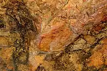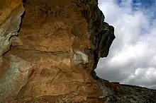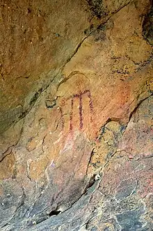 The rock and cave art is found in shelters made of sandstone. The paintings, of symbolic character, appear in twenty-five of these shelters and date from the post paleolithic era. Within their complex designs, one finds isolated patterns grouped together. The designs were produced with different shades of red mainly using the fingers. Anthropomorphic shapes predominate and were represented in a variety of ways, some with added elements showing headdresses, costumes, weapons, etc. The painted objects themselves are also varied and remain characteristic of these displays; they comprise arrangements which are circular, branched, bi-triangular, quadrangular, braided, comb-like and ocular.