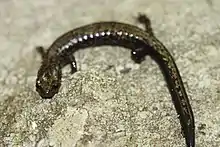 The Peaks of Otter salamander (Plethodon hubrichti) is a species of salamanders in the family Plethodontidae. It is endemic to the Peaks of Otter area in the Blue Ridge Mountains of Virginia.[1][2] It is a montane salamander found at elevations above 442 m (1,450 ft),[3] but more commonly above 760 m (2,490 ft). It can be locally common, but its distribution is small and patchy. This makes it vulnerable to local threats such as timber harvesting, recreational development, defoliation by gypsy moths, and spraying to control the latter.[1]
