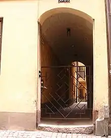 Small backyard at Peder Fredags Gränd viewed from Staffan Sasses Gränd. The backyard was created in the 1940s, the wall anchors on the western façade, however, reveals the building was rebuilt at various occasions, the oldest being from the medieval era.
