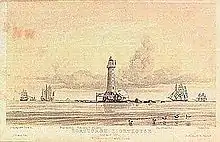 Although the private subscribers wishing to commemorate Horsburgh had raised a sum which, with compound interest, came up to more than 7,400 Spanish dollars when it was paid over to the Singapore authorities,[31] there was still a shortfall of funds for the building works. Thus, the Government of India, in agreement with the East India Company, authorised Governor Butterworth to prepare a law imposing a duty on vessels entering Singapore and asked him to take immediate measures to begin constructing the lighthouse.[32] The Light Dues Act 1852 was duly enacted by the Governor-General of India in Council on 30 January 1852.[33] Thomson, appointed by the Governor as the architect for the project, took charge of planning and supervising the construction of Horsburgh Lighthouse.[32] Construction work began in late March or early April 1850.[34] On Queen Victoria's birthday, 24 May 1850, the foundation stone was laid at a ceremony conducted by members of the newly founded Masonic Lodge Zetland in the East No. 749 and attended by the Governor, the commander of the Singapore garrison, a rear admiral and several foreign consuls.[35] The construction of the lighthouse then continued till 21 October, and resumed after the monsoon in April 1851. Up to 50 workmen were involved, including Chinese carpenters and stonemasons and their Malay assistants, Indian quarrymen and convict labourers, a cook and his assistant, and six lascars to defend the island from attack by pirates. The pirates of the South China Sea were notorious – during the construction of Horsburgh Lighthouse nine Chinese labourers were killed in pirate raids.[26] Building materials and supplies were brought by the Hooghly, supported by two gunboats and two lighters. Unless he was required elsewhere, Thomson stayed on the island to supervise the works.[36] The ceremonial first lighting of the lamp was arranged for 27 September 1851, again attended by the Governor, Masons of the Zetland Lodge, foreign dignitaries, senior residents of Singapore and other notables; the Singapore Free Press reported: "A simultaneous rising [of the guests from the dinner table] announced that the process of illumination had commenced. Three hearty cheers welcomed the light, the meteor-like brilliancy of which will probably serve to guide the midnight path of the mariner for a thousand years to come."[37] On 15 October the lighthouse was permanently turned on, and Thomson finally departed Pedra Branca for Singapore on the Hooghly on 18 November 1851.[38]