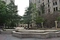 Pegasus Plaza was created as the centerpiece of a $7 million restoration program for the historic Main Street District. The project reconstructed Main Street and included new lighting, landscaping and street furniture in hopes of spurring redevelopment of many Dallas historic structures.[1] The $2.5 million plaza, an idea of the Dallas Institute of Humanities and Culture, was paid for with $750,000 of 1982 bond election money and private donations, including $500,000 from actress Greer Garson.[2]