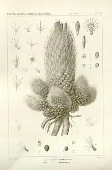 The first description as Mammillaria tuberculosa by George Engelmann was published in 1856.[5] The specific epithet tuberculosa comes from Latin, means 'humpy' and refers to the bumpy shoots of the species. Nathaniel Lord Britton and Joseph Nelson Rose placed the species in the genus Escobaria in 1923.[6] Nomenclature synonyms are Coryphantha tuberculosa (Engelm.) Orcutt (1922) and Coryphantha tuberculosa (Engelm.) A.Berger (1929).