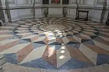 The coffered dome with rosettes on a blue background, surmounted by a lantern, covers the chapel;[22] the effect given by the color makes the interior space look majestic while the plasticity of the decorations is enhanced by the light that penetrates from the lantern and the stained-glass windows of the drum, giving the monument as a whole a striking elegance.[15] The dome with drum, present here for the first time, became a Sanmichelian stylistic feature, as can be seen in the domes of the church of Madonna di Campagna, San Giorgio in Braida and the temple of Lazzaretto.[23]