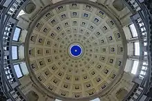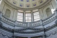 The first order is surmounted by a balcony with parapet, at the height of which begins the second, larger-diameter level, also of Corinthian order, which serves as the drum on which the dome is set; it is distinguished by the presence of four aediculae and four large tripartite windows with coupled columns that are located at the tabernacles of the lower level.[18][22] A peculiarity, compared to the first order, is that only the columns and entablature are made of stone, while the rest is in lime plaster and marble dust, although the resulting surface has been bush-hammered and scraped as if it had been stone.[18]