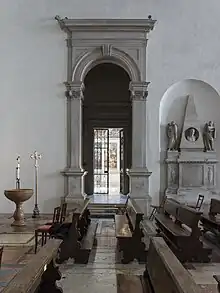 While the exterior is devoid of decoration and the dome is adorned by a lantern, a style that is well suited to the sobriety of the Franciscan spirit, the interior, on the other hand, is distinguished by a compact and rigorous articulation of space and by the presence of an elegant decorative apparatus, which clearly echoes that of Porta Borsari, such as the alternation of vertical and twisted fluting, the rhythm of projections and recesses, and the giant tabernacles.[17]