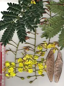 Peltophorum dasyrhachis is a deciduous flowering tree growing to 30 meters. It is native to Southeast Asia (Cambodia, Indonesia, Laos, Malaysia, Thailand, Vietnam) and introduced to Africa (Ivory Coast, Sierra Leone, Tanzania, Uganda). It produces drooping racemes of fragile yellow flowers that bloom in Thailand in early March.