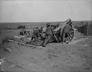 For the final part of the Battle of the Selle on 23 October, II US Corps was relieved by the British IX Corps, which took over most of the Australian and RGA artillery.[66][67] This massive corps artillery reserve supported the attack into the wooded slopeds beyond the Selle. Again, bad weather hindered air observation and CB work before the attack, but the barrage was deadly accurate. As the regimental historian relates, "The guns of Fourth Army demonstrated, on 23rd October, the crushing effect of well co-ordinated massed artillery. They simply swept away the opposition".[68] After a pause to regroup and reconnoitre, IX Corps stormed across the Sambre–Oise Canal on 4 November (the Battle of the Sambre, see above). After that the campaign became a pursuit of a beaten enemy, in which the slow-moving siege guns could play no part. 114th Siege Battery was disbanded in 1919 after the Armistice.[40][69][70][71]