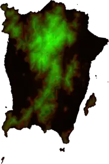 A heightmap of Penang Island and surrounding islands plotted from ASTER GDEM data and coloured to allow easy extraction of height data in metres