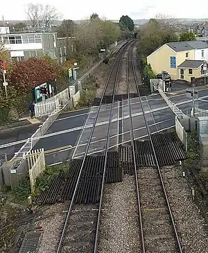 Platform 2 can accommodate a five-coach train and is 186 miles 49 chains (300.3 km) from the zero point at London Paddington, measured via Stroud; the level crossing is at 186 miles 55 chains (300.4 km); whilst platform 1 can accommodate a four-coach train and is at 186 miles 60 chains (300.5 km).[2]