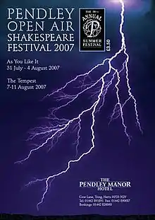 The Pendley Open Air Shakespeare Festival is, as the name implies, an annual festival dedicated to the plays of William Shakespeare. It takes place at the beginning of August at Pendley Manor, a hotel in Tring, Hertfordshire.