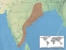 They are found in southern India, south of about 16°N latitude. In the Western Ghats, Nilgiris, South Arcot, and Nallamalai Hills, they are found in the hilly regions at altitudes up to 6000 ft above sea level in the Nilgiris. It is very common in some parts of the Nilgiris and it was noted as being particularly common near Bangalore by M.A. Smith in The Fauna of British India.[5]