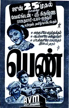 Penn (transl. Girl) is a 1954 Indian Tamil-language romantic comedy film written by Ra. Venkatachalam and directed by M. V. Raman. It stars Vyjayanthimala, Gemini Ganesan, S. Balachander and Anjali Devi while V. Nagayya, V. K. Ramasamy, K. N. Kamlam, K. R. Chellam and K. Sankarapani as the ensemble cast, was produce by A. V. Chettiar of AVM Productions. The score is composed by R. Sudharsanam with the lyrics by Papanasam Sivan and Udumalai Narayana Kavi, Ku. Sa. Krishnamurthy, K. P. Kamakshi and V. Seetharaman. Editing was done by K. Shankar and M. V. Raman while the camera was handled by T. Muthu Sami.