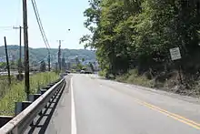 PA 225 begins at an interchange with the US 22/US 322 freeway in Middle Paxton Township, Dauphin County, heading east on Peters Mountain Road, a four-lane divided highway. The route soon becomes a two-lane undivided road and runs through wooded areas with some residences. The road briefly enters the borough of Dauphin, where it turns north back into Middle Paxton Township and heads through rural areas of homes. PA 225 turns to the northwest and intersects PA 325, at which point that route comes from the east to turn north and form a concurrency with PA 225. The road passes through woods before heading into agricultural areas, with PA 325 splitting to the west. Past this, the route turns northeast to ascend forested Peters Mountain. At the summit, the road heads into Halifax Township and passes under a bridge carrying the Appalachian Trail, making a hairpin turn to the west to descend the mountain. PA 225 makes another hairpin turn to the northeast before turning north and coming into a valley containing agricultural areas with a few homes. The route runs north-northeast before passing through the residential communities of Powells Valley and Matamoras, heading more to the north at this point. PA 225 turns northeast again and intersects PA 147, at which point that route turns northeast to join PA 225. The road gains a center left-turn lane and heads north through rural areas of homes and businesses. The two routes continue into the borough of Halifax and become South 4th Street, losing the center left-turn lane and passing several homes. PA 147 splits from PA 225 by heading west on Market Street, and PA 225 continues north on North 4th Street. The route turns east onto Armstrong Street, passing more residences and some businesses.[2][3]