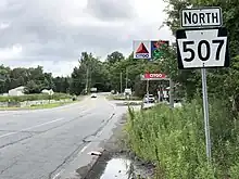 PA 507 begins at PA 435 and I-380 in Coolbaugh Township, Monroe County, heading northeast on a two-lane undivided road. From the terminus, Coolbaugh Road continues southwest.[2][3] A short distance later, the road enters Lehigh Township in Wayne County and becomes Main Street, running through dense forests with some homes to the north of Gouldsboro State Park. PA 507 curves to the east and heads through wooded areas of homes, entering the community of Gouldsboro, where it crosses a Delaware-Lackawanna Railroad line. The road continues north-northeast through dense forests with some private residential developments. The route heads into Dreher Township and becomes Millcreek Road, coming to an intersection with PA 196 in Angels. PA 507 continues northeast through more forests with some housing developments, curving east and coming to an intersection with PA 191. Here, the route turns north to form a concurrency with PA 191, heading north on Main Street through wooded areas with some fields and homes to the west of Wallenpaupack Creek. The road curves to the north-northeast and intersects the northern terminus of PA 447 in Newfoundland. The two routes pass through rural residential and commercial development before PA 191 splits to the northwest and PA 507 heads northeast as Lake Wallenpaupack Road.[2][4]