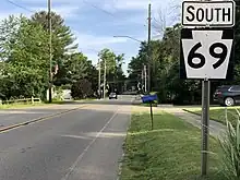 Pennsylvania Route 69 (PA 69) is a state highway in Warren County in the U.S. state of Pennsylvania. The state highway runs 14.313 miles (23.035 km) from U.S. Route 62 (US 62) in Conewango Township near Warren north to the New York state line in Sugar Grove Township, where the highway continues north as County Route 69 (CR 69) in Chautauqua County. PA 69 connects Warren, Sugar Grove, and the Chautauqua Lake area.