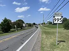 Pennsylvania Route 995 (PA 995) is a 19-mile-long (31 km) north–south state route in south central Pennsylvania. The southern terminus of the route is at PA 75 in Claylick. The northern terminus is at U.S. Route 30 (US 30) west of Chambersburg. The road carries the names Welsh Run Road, Lemar Road, and Warm Spring Road. PA 995 is a two-lane undivided road that runs southwest-northeast through farmland in southwestern Franklin County. The route crosses PA 416 in Welsh Run and forms a concurrency with PA 16 in Upton. PA 995 was designated in 1928 between Williamson and US 30 west of Chambersburg. The route was extended southwest to PA 75 in Claylick in 1937, with the road paved in the 1930s.