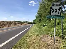 PA 997 begins at the Maryland state line in Washington Township, Franklin County, where the road continues south into that state as MD 64. From the state line, the route heads north-northwest as two-lane undivided Anthony Highway through farmland with some trees and homes. The road crosses the East Branch Little Antietam Creek and soon enters the borough of Waynesboro, where the name becomes State Hill Road, where it passes residences and commercial development. PA 997 curves northwest and immediately turns northeast onto Clayton Avenue, passing homes and coming to an intersection with PA 16. Here, the route turns northwest to form a concurrency with PA 16 on East Main Street, passing homes and businesses before continuing into the downtown area.[3][4]