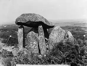The dolmen dates from around 3500 BC, and has traditionally been identified as a communal burial. Under this theory the existing stones formed the portal and main chamber of the tomb, which would originally have been covered by a large mound of stones about 30 m (98 ft) long and 17 m wide.[4] Some of the kerbstones, marking the edge of the mound, have been identified during excavations. The stone chamber was at the southern end of the long mound, which stretched off to the north. Very little of the material that formed the mound remains.[4] Some of the stones have been scattered, but at least seven are in their original position. An elaborate entrance façade surrounding the portal, which may have been a later addition,[6] was built with carefully constructed dry stone walling. Individual burials are thought to have been made within the stone chamber, which would be re-used many times.[6] No traces of bones were found in the tomb, raising the possibility that they were subsequently transferred elsewhere.