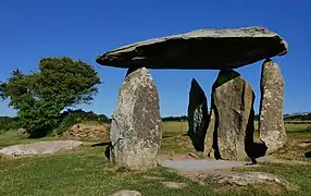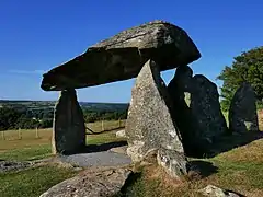 First, such monuments typically have a large capstone derived from a glacial erratic, far bigger than is required or sensible if the aim is to roof a chamber. Furthermore, the capstone has a flat underside. Sometimes, as here, this has been arrived at by splitting the rock; at other sites, such as Garn Turne, some 12 km to the south-west, it has been laboriously 'pecked' off using stone tools.[8] The capstone is supported on the tapering tips of slender uprights. As at Pentre Ifan, there are often other stones within the group, but they play no part in holding up the capstone, and the resulting effect of the enormous stone appearing to float above the other stones would seem to be deliberate and desired.[8] If these are the key elements of the monument then, it is argued, the stones were never designed to be buried within a mound, and they never formed a chamber to contain bones. What we see today is the monument as it was intended to be seen.[9] It might therefore represent a more elaborate version of a standing stone. Its purpose could be simply to demonstrate the status and skill of the builders, or to add significance and gravitas to an already significant place.[10]