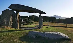 Pentre Ifan (literally "Evan's Village") is the name of an ancient manor in the community and parish of Nevern, Pembrokeshire, Wales. It is 11 miles (18 km) from Cardigan, Ceredigion, and 3 miles (4.8 km) east of Newport, Pembrokeshire. Pentre Ifan contains and gives its name to the largest and best preserved neolithic dolmen in Wales.