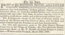 A tourist guide of 1821 comments that John Partridge was proposing to build a new house on his estate at Weston.[4] So it was at about this time that a major new extension was built adjacent to and east of the existing farm house, which had probably previously been occupied by the bailiff of the Lower Weston Estate. It was still regarded as part of the "Lower Weston" estate and in 1830 it was advertised for rent. The rental notice is shown.