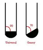 The universal curette is double-ended with paired mirror-image working ends.[1] The working end has a rounded back and a rounded toe with a semicircular cross section.[5] This design allows the instrument to be used both below and above the gingival margin.[5] The face of the instrument is at a 90-degree angle to the lower shank and contains two cutting edges on either side of the working end that are level with one another.[5] Depending on the type of universal curette, shank length, design and blade size, application of usage may vary.[5] With this being said, universal curettes can still be used throughout the entire mouth.[5]