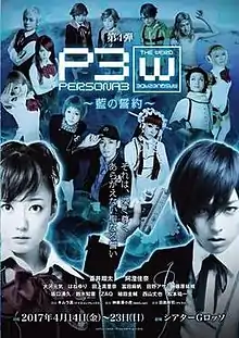 Persona 3: The Weird Masquerade (舞台『PERSONA3 the Weird Masquerade』) is a series of stage musicals produced by Clie based on the 2006 PlayStation 2 video game Persona 3 and its 2009 PlayStation Portable version Persona 3 Portable. Directed by Makoto Kimura,[1] the plays used music by Shoji Meguro from the original games, with new songs by Mako Kuwabara.[2][3] The plays were written by Kotora Kagurazaka. Jun Kumagai, the screenplay writer of the Persona 3 movies and Persona 4: The Animation, co-wrote The Blue Awakening and The Ultramarine Labyrinth with Kagurazaka. The musicals ran from 2014 to 2017.