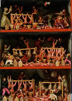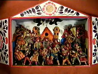 The use of wood for the outside box remained, but other materials, such as gypsum, clay, or a potato-gypsum-clay paste mix, were increasingly used for the figures because of their ease of handling and durability.