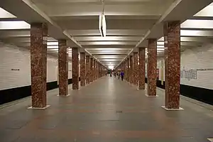The station was the first to be built to the standard column tri-span design which would from then become the most widespread in Moscow Metro and in other ex-USSR cities, with slightly flared red marble pillars and tiled walls. The architects were M. F. Markovsky and Ya. V. Tatarzhinskaya.