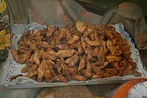 A pestiño is a Christmas or Holy Week pastry that is popular in Andalusia and other regions of southern Spain.[1] It is a piece of dough, deep-fried in olive oil and glazed with honey or cinnamon sugar.