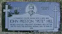 Hill was inducted into the Baseball Hall of Fame in 2006 along with 16 other Negro league and pre-Negro league figures.[11] In late July 2010, the Hall of Fame announced that it would commission a new plaque to correct Hill's name from Joseph Preston Hill to John Preston Hill. The new plaque was unveiled at a ceremony on October 12, 2010, attended by Hill's relatives and researchers.[12] Although he died in Buffalo, NY, he is buried in Holy Sepulchre Cemetery in Alsip, Illinois.[13] His grave, originally unmarked, has a marker provided by SABR.