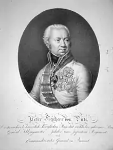 Friedrich Peter Freiherr Duka von Kádár (Serbian Cyrillic: Петар Дука; Esseg, Slavonia, 1756 - Vienna, Austrian Empire, 29 December 1822) was of Croatian Serb ancestry[1] privy councillor,[2] officer (Feldzeugmeister) and owner of the Hungarian Infantry Regiment No. 39, then State and Conference Council of the Emperor.[3] He was a recipient of the Knight's Cross of the Military Order of Maria Theresa. He is remembered as a great adversary of Napoleon[4] and to have negotiated an armistice with him at Lusigny-sur-Barse.