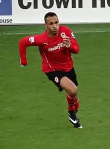 On 2 September 2013, Odemwingie signed a two-year contract with Cardiff City for £2.25 million.[57] Speaking after the move Odemwingie stated that he was eager for a fresh start in his career.[58] He made his debut on 22 September 2013 in a 1–0 defeat against Tottenham Hotspur.[59] He scored his first goal for the club two days later in a 3–2 defeat against West Ham United in the League Cup.[60] He also scored in a 2–1 loss against Newcastle United on 5 October 2013.[61] He developed a good relationship with manager Malky Mackay who stated that Odemwingie "is a joy to work with".[62][63] However Mackay was replaced with Ole Gunnar Solskjær in January 2014 and Odemwingie fell out of favour.[64]