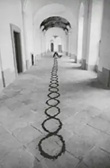Since 1993 Petr Kvíčala has created a number of ephemeral installations – mostly on the floors of galleries and in public space. Major installations are e.g. send lines in Plasy convent (1993), the red pigment installation in Behémot gallery in Prague (1994) or contemporary Zig Zag street art in Brno (2009).