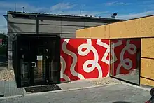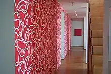 The motive of Memory cycle was used for wall paintings in Rischart building in Munich (2007). The target to achieve was to create environment which is not only positive but also outstanding and which makes it possible for the employees to identify with. Those paintings are repeated in the areas of central communications: in the corridors of the cloakrooms located in the basement, in the high lit part of the staircase leading from the second to the fifth floor, as well as in the central area in front of the offices of the owners and in the meeting room of the fifth floor, around the staircase leading to the café for the employees on the sixth floor.. "Restricting the lines by surrounding red areas, the memory of the line and fragments of the ornaments is a sort of an imprint on one's mind. I thought of the ancient concept of Crete in which unlike in the Greek one everything is floating, everything is shown in non-existence and does not manifest its achievement and the drama of the fight. It is a world of gardens determined for solitary confinement, for rest and meditation, for the world I sometimes long for and which I can relate to."[9]