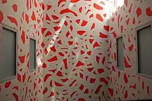 In 2005 Petr Kvíčala cooperated, with architects A. Novák and P. Valenta, on the reconstruction of the historical building of Reduta theatre in Brno. He is author of the mural "40 Days of Red" in Reduta ballroom hall, atrium floor and ceiling arches of the theatre café. The mural consists of layers of red undulating lines laid next to one another. on a red background. In each of the superimposed layer the undulating lines have a different direction. The monochrome effect of the red paint, together with the colour of the parquet flooring arranged into historical patterns conjures up a solemn ambience nurtured by the rare occurrence of the colour red in the nature patterns, and even more so by its endorsement of the cultural and historical tradition. "The regular layers of repeatedly painted undulating lines impregnates the walls with aspects of time, exertion and sumptuousness. No celebration can take place without show and splendor as, in essence, a 'purposeless' celebration is the most natural human response to the mystery of life".[8]