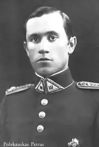 During the German occupation of Lithuania during World War II, Polekauskas served in the Lithuanian Auxiliary Police Battalions.[1] During 16-25 July 1941, Polekauskas served in the Vilnius garrison's 2nd Defence Regiment.[2] From August 1941, he commanded one of the three companies of the 15th "Gardinas" Lithuanian Auxiliary Police Battalion.[2][3] With his company, he was sent all over Byelorussia and north-eastern Lithuania.[1] From May 1942, Petras Polekauskas was the adjutant of the 254th Lithuanian Auxiliary Police Battalion's commander.[4] In early 1944, based on the unit's surviving orders, Petras Polekauskas was the commander of the Assembly Company (Lithuanian: Rinkimosi kuopa) of the 258th Battalion.[5] On 20 June 1944, Petras Polekauskas ordered 50 soldiers, roughly half of 3rd Company of the 258th Lithuanian Auxiliary Police Battalion,[6] to commit the Glitiškės massacre.[7]