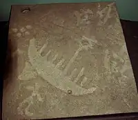 The stone is generally believed to have been carved by the Algonquian or Iroquoian speaking people between 900 and 1100 AD., if not somewhat earlier during the Archaic. Today, the First Nations people of Ontario call the carvings Kinomagewapkong, meaning "the rocks that teach" or "the Teaching Rocks". Originally two to three inches deep the 1200 carvings were made using gneiss hammers to incise human figures, animals, and a dominant figure whose head apparently represents the sun, onto the soft, gently sloping walls.[3]